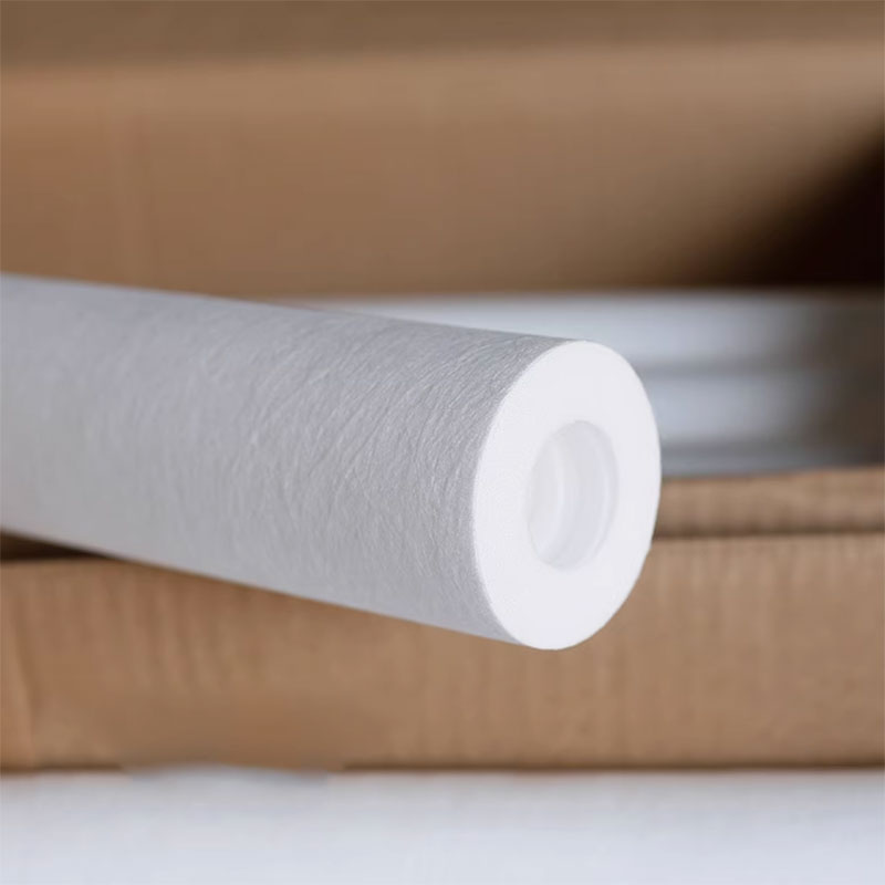 如图所示,滤芯呈白色圆柱状,内外径尺寸标准,兼容性强。其独特的“外松内紧”结构能有效提高污染物容纳量,延长更换周期。广泛应用于家用/商用净水器的前置粗过滤、工业用水预处理、反渗透(RO)系统保护、食品饮料液体澄清、电镀液过滤等多个领域。